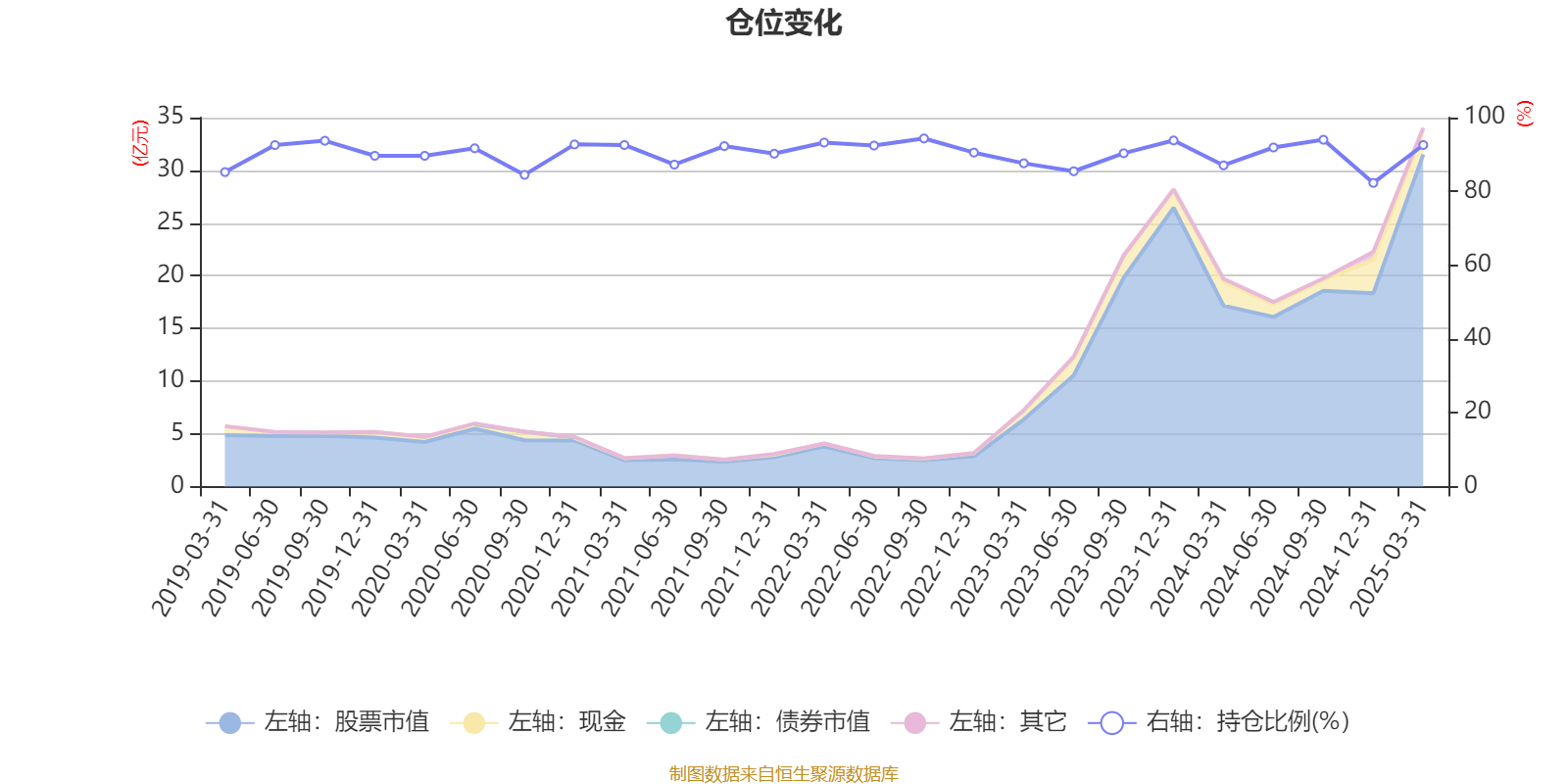 据定期报告数据统计,近三年平均股票仓位为90.2%,同类平均为87.97%。2022年三季度末基金达到94.35%的最高仓位,2024年末最低,为82.3%。