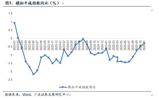 按照CPI和PPI权重分别60%和40%粗略模拟,平减指数同比在2025年内的低点是7月的-1.44%,8月和9月先后回升至-1.4%、-1.1%;10-12月则进一步回升至-0.72%、-0.46%和-0.28%。